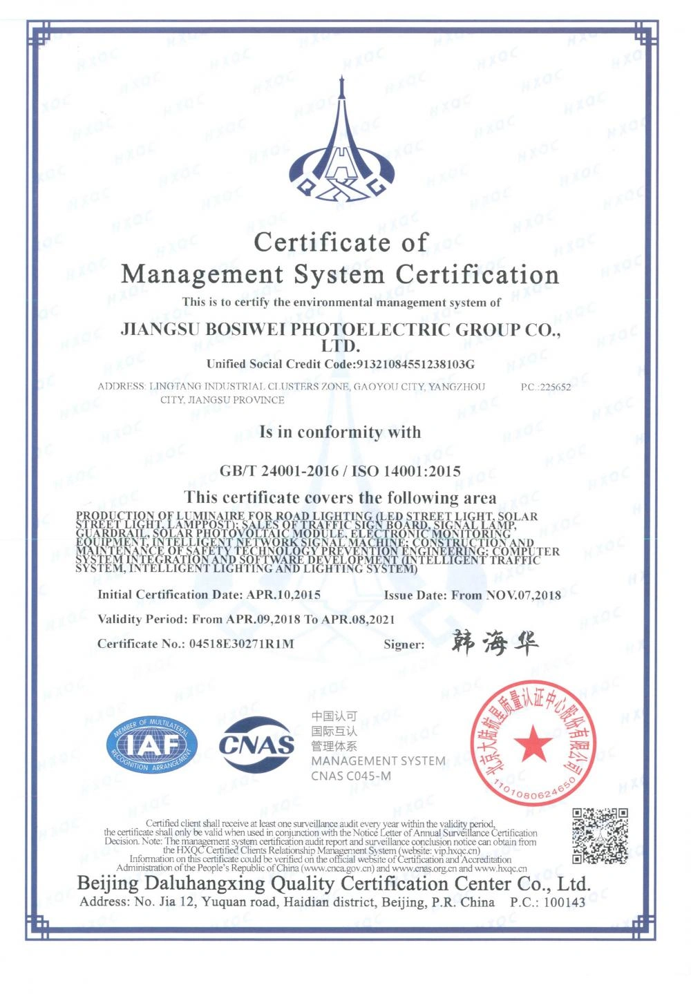 管理体系认证证书